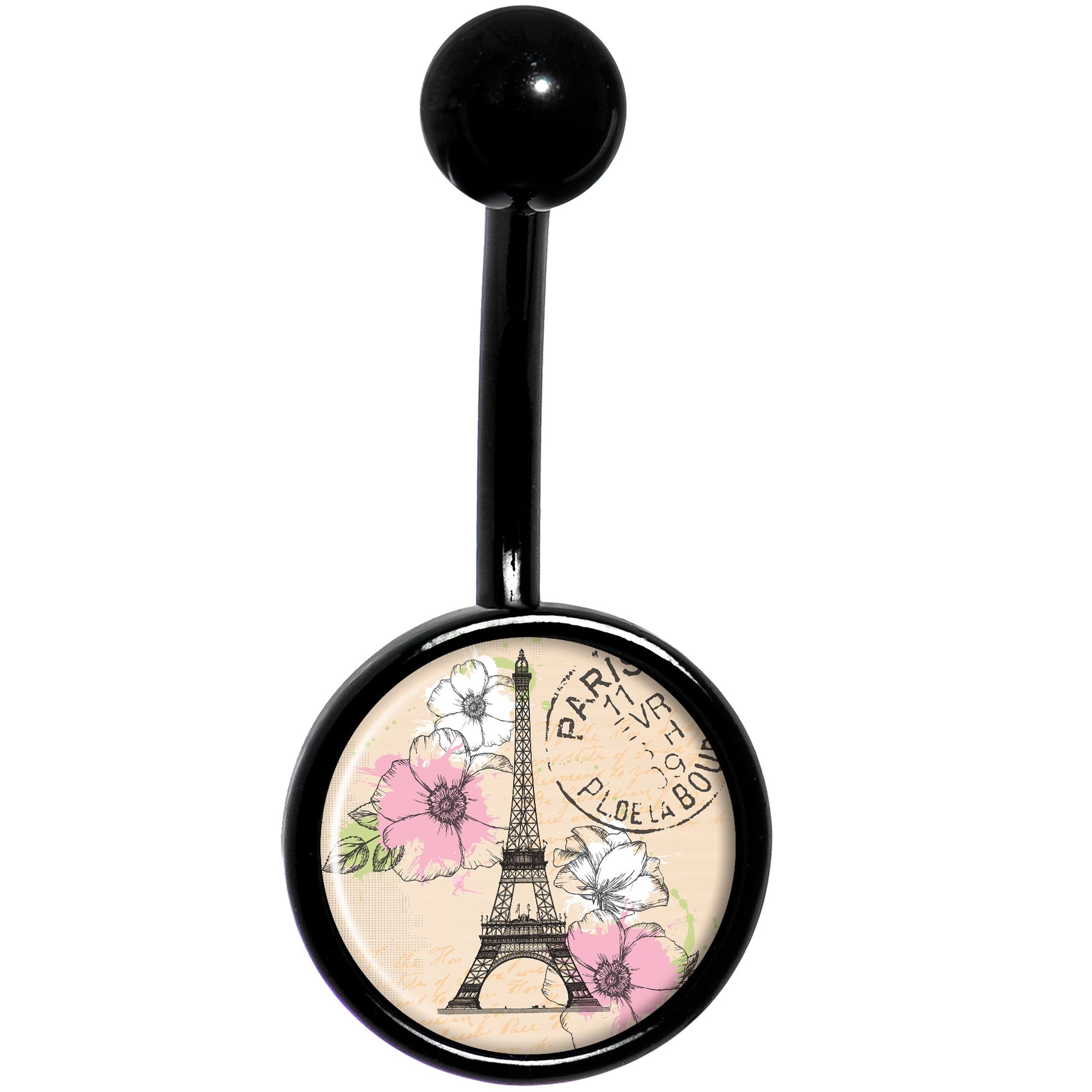 If you love travelling to romantic cities like Paris then this 14 gauge belly button ring is right for you! Made with a 7/16" black anodized over 316L surgical grade stainless steel curved barbell, this navel jewelry features a black Eiffel Tower over floral print design logo inlay.