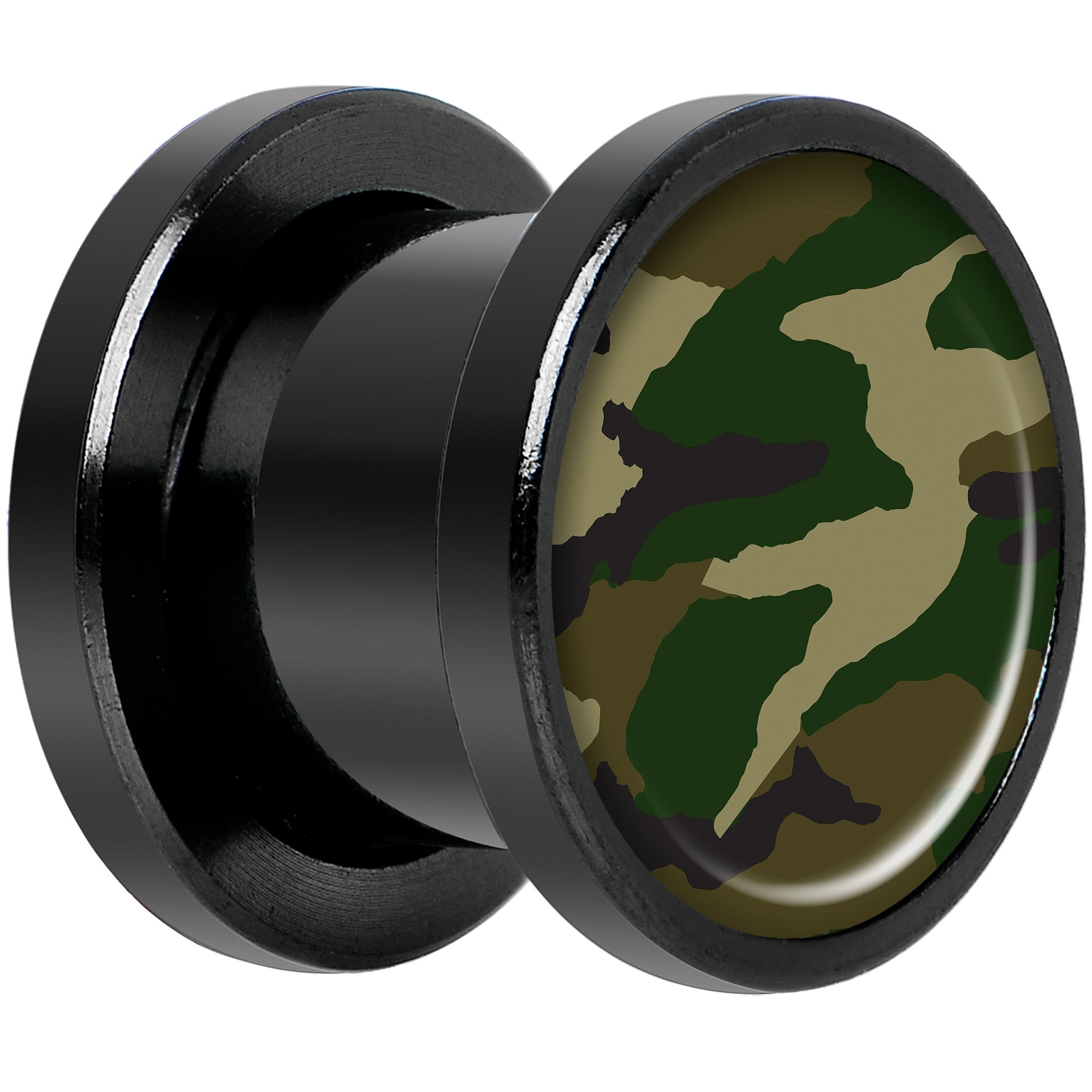 If you love a classic woodland camo pattern then this pair of double flare plugs is right for you! Made with black anodized over 316L surgical grade stainless steel, these 10mm ear gauges are made with a screw fit design for easier insertion and removal and are sold as a set of two for you.