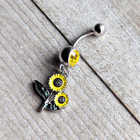 The sun is out and ready to make you smile with this 14 gauge navel ring. It is made with a 3/8 inch 316L surgical grade stainless steel curved barbell with a 5mm top ball end. The bottom ball end is 8mm and set with a yellow gem, Dangling beneath it is a yellow double sunflower charm with textured detailing at their edges. They are further embellished with a yellow and brown inlay and green inlaid leaves. Make every day a sunny day with this striking sunflower belly piercing jewelry.