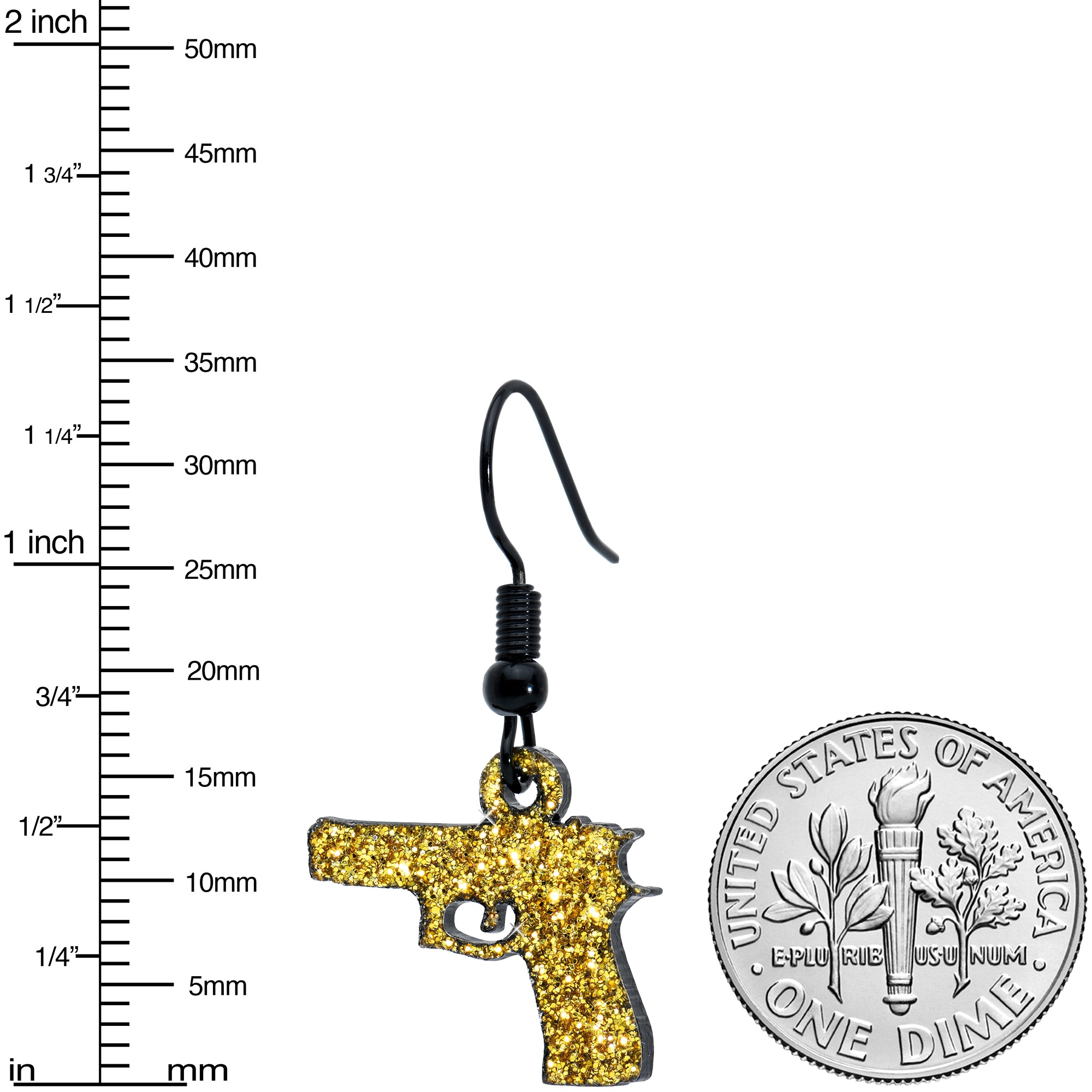 These glitter gun earrings are made with black plated fishhook wires and feature 9/16" long acrylic yellow glitter gun dangle charms. Get your glitter on with these charming color glitter gun dangle earrings! Sold as a set of two.