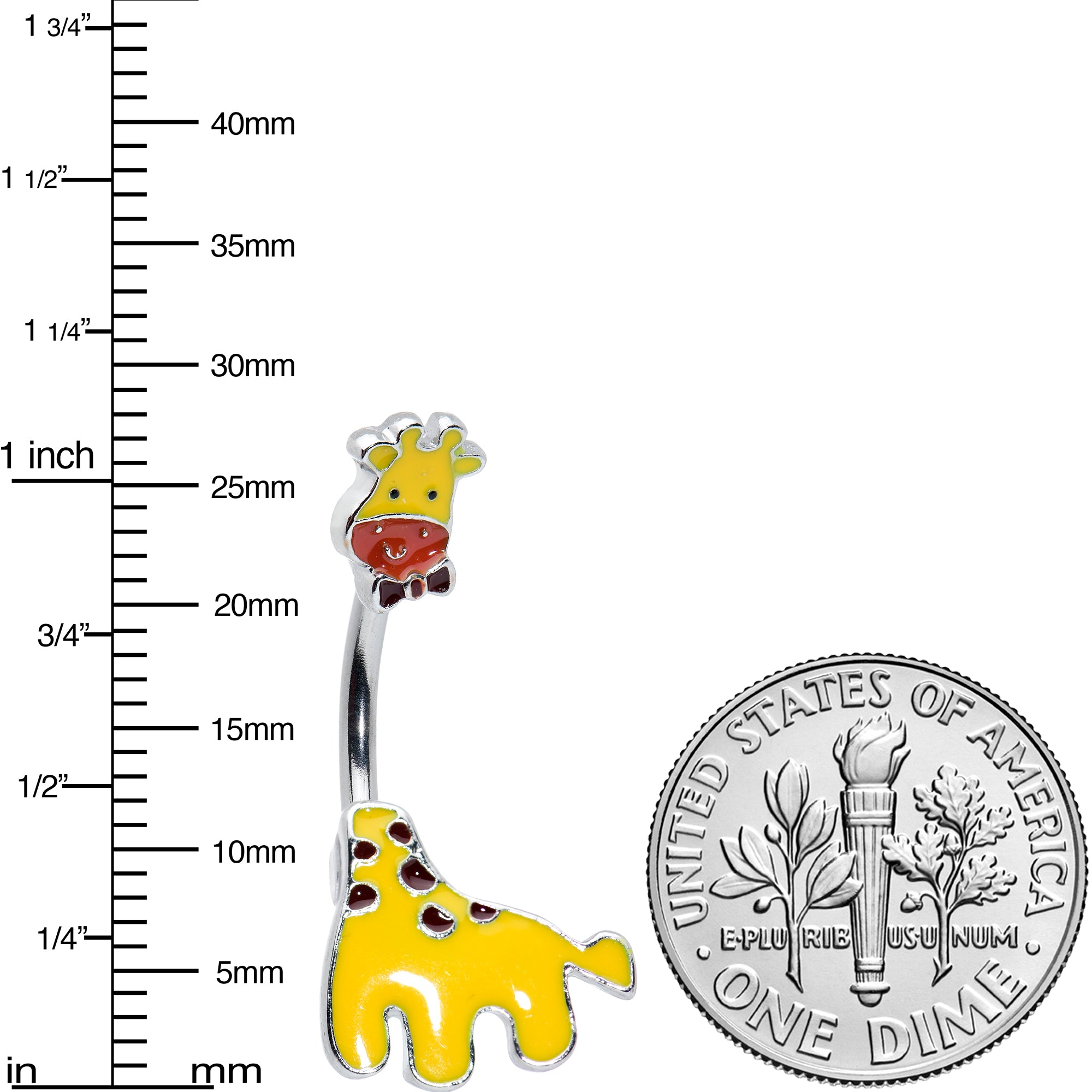 With this 14 gauge navel ring, your look will be head and shoulders above the rest of the crowd! It's made with a 3/8" durable 316L surgical grade stainless steel curved barbell. It features a giraffe charm, inlaid in yellow and red. The giraffe is sporting a snappy little bow tie, giving it a look that's both dapper and whimsical. The top end features his head while the bottom end is composed of the giraffe's body. This snappy dresser is sure to add a cute and comical look to your navel piercing!