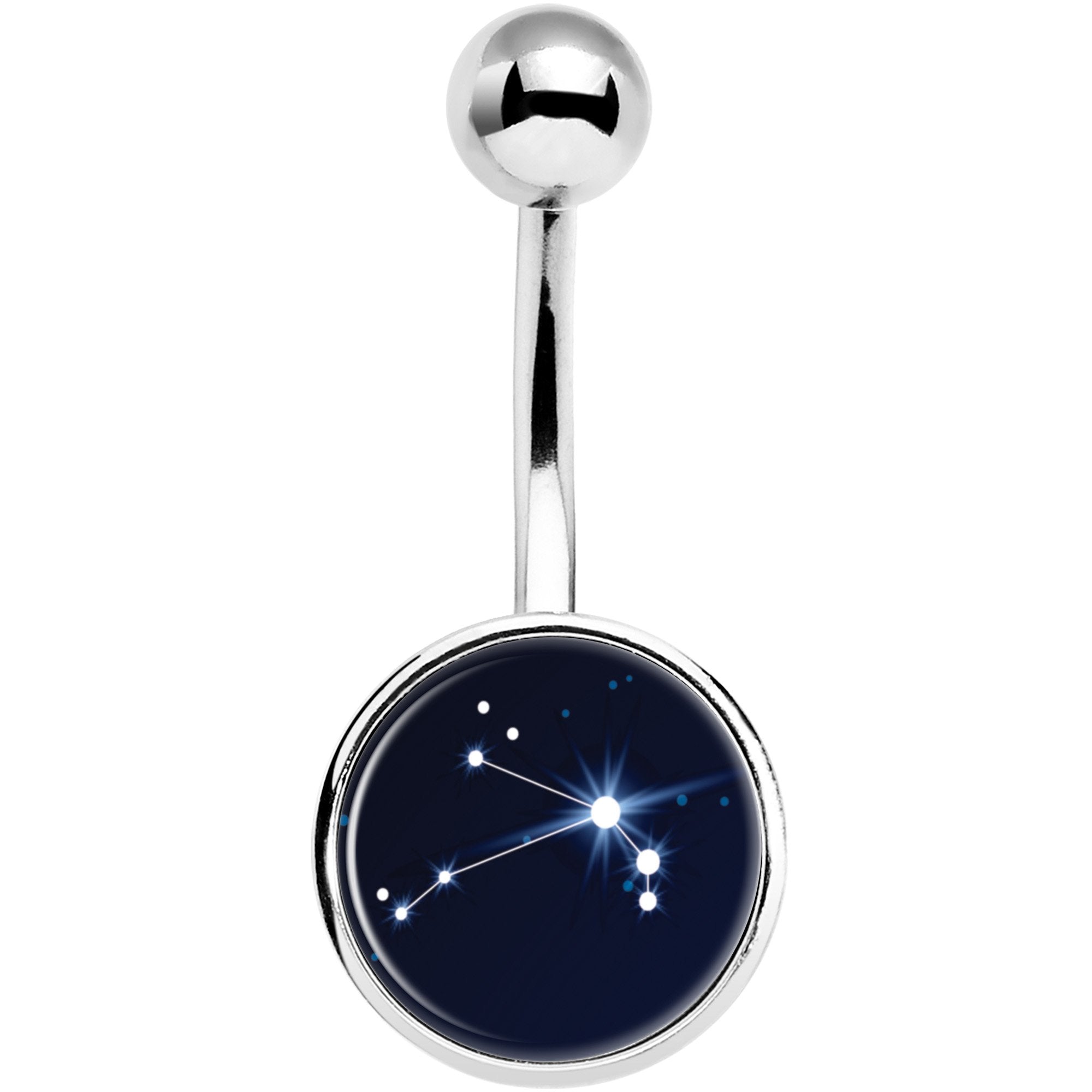If you know all about your zodiac constellation and are all Aries at heart then this navel jewelry is right for you! Made with a 7/16" durable 316L surgical grade stainless steel curved barbell, this belly button ring features the constellation Aries on a black background logo inlay.